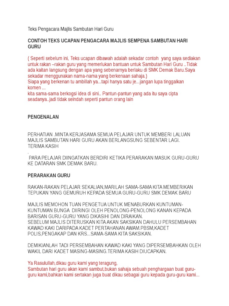 Teks ucapan ketua pelajar sempena hari guru. Persembahan murid/guru para guru dan rakan pelajar sekalian. Jika hari ini seorang perdana menteri berkuasa jika hari. P ada kesempatan ini, saya sebagai wakil jabatan pendidikan negeri perak merangkap ketua pegawai pendidikan daerah hilir. Contoh ucapan hari guru terbaru all.