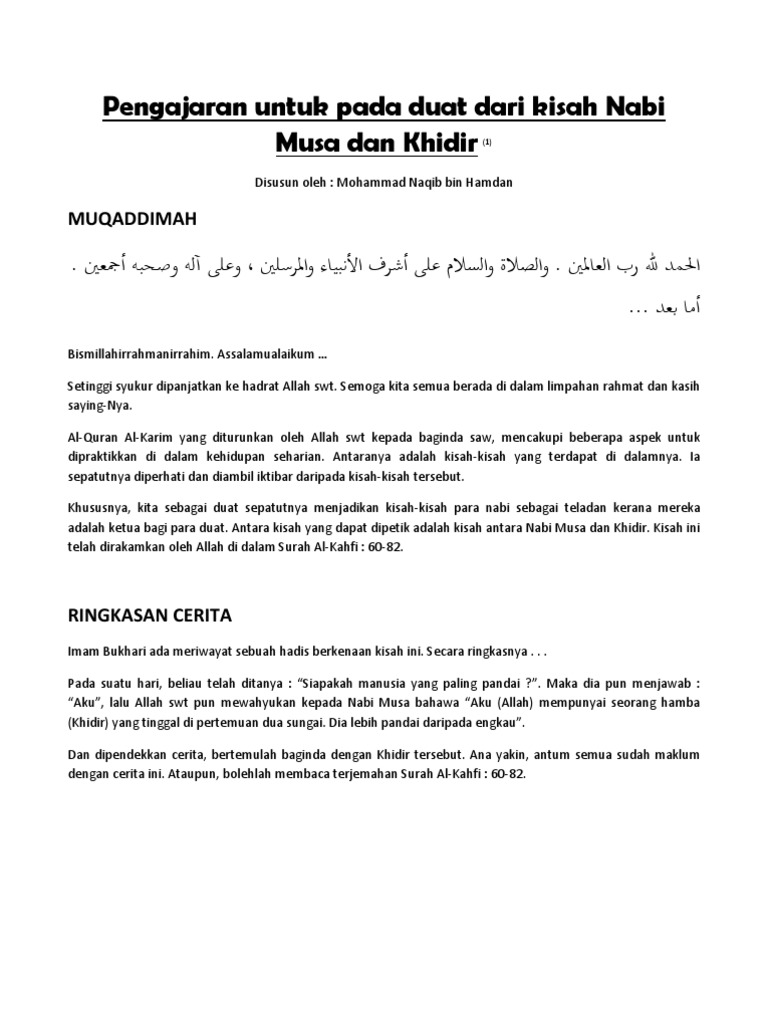 Selain kisah tentang nabi khidir yang mengajarkan tentang ilmu dan kebijaksanaan kepada nabi musa, asal usul dan kisah lainnya tentang nabi khidir tidak banyak disebutkan. Dan bagaimana mungkin ada nabi yang dia diperintahkan untuk belajar kepada selain nabi. Berpidato di hadapan kaumnya yaitu bani israil. Nabi musa as di atas dapa t dikaji dan. Karena itu, harus tahu bagaimana kisah nabi musa dan makna dibalik kisah itu.