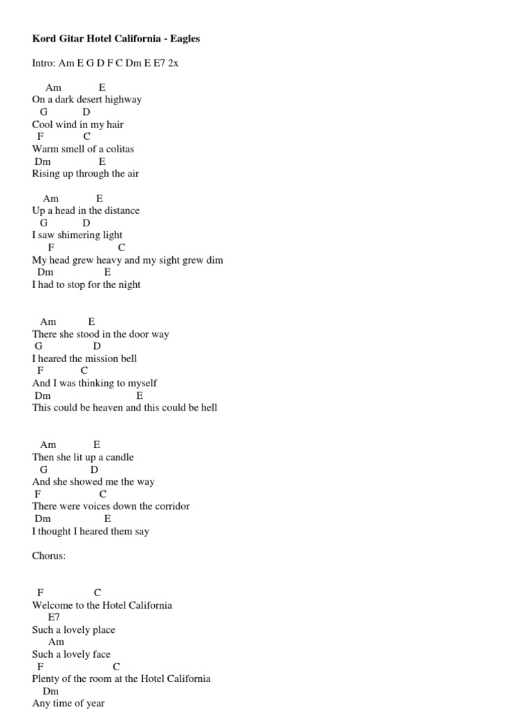 Hotel california meraih grammy award untuk kategori record of the year 1978. On a dark desert highway, cool wind in my hair. Itulah lagu hotel california, lagu legendaris dari kelompok eagles. Such a lovely place, (such a lovely place), such a lovely face. Dalam gelap jalan raya gurun, angin dingin menghelai rambutku.