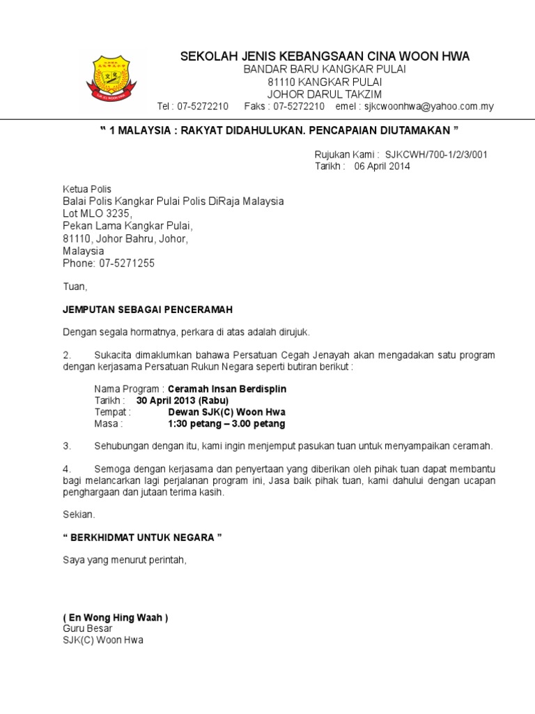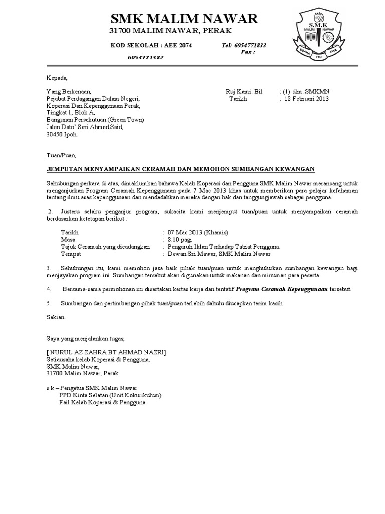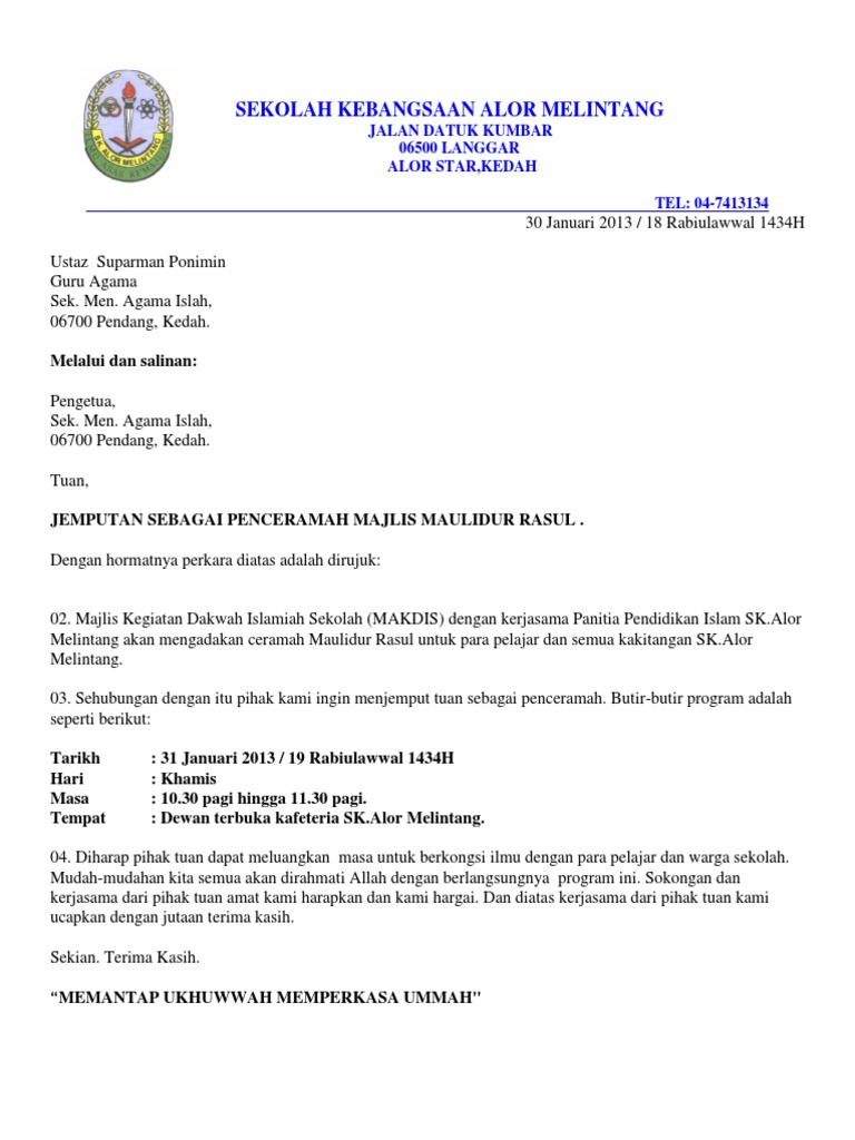 Contoh Surat Rasmi Jemputan Ceramah Rasmi H from image.slidesharecdn.com Jemputan itu diterima, namun selepas tibanya badiuzzaman ke ankara, dia tidak dapat bersekongkol dengan mereka kerana beliau mendapati anggota kabinet itu tidak patuh kepada syariat islam. Semoga info dan maklumat ini dapat membantu anda dalam memastikan segala kerja berjalan lancar Kertas kerja umum kertas kerja sidang serentak. Setiap orang pasti membutuhkan yang namanya kertas. Ada kawan meminta saya agar membuat kertas kerja untuk hikmah iv yang akan diadakan di akademi nik rashiddin kurang 2 minggu lagi, agar dapat menyenangkan kawan beliau mendapatkan pertolongan yang patut untuk menjayakan acara. Sukacita dimaklumkan bahawa unit kerohanian dan bina insan dengan kerjasama panitia pendidikan islam smk seksyen 10 kota damansara akan mengadakan program sambutan maulidurrasul. 5membuat surat jemputan kepada penceramah. Kerjasama di pihak puan kami dahului dengan ucapan terima kasih.
